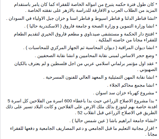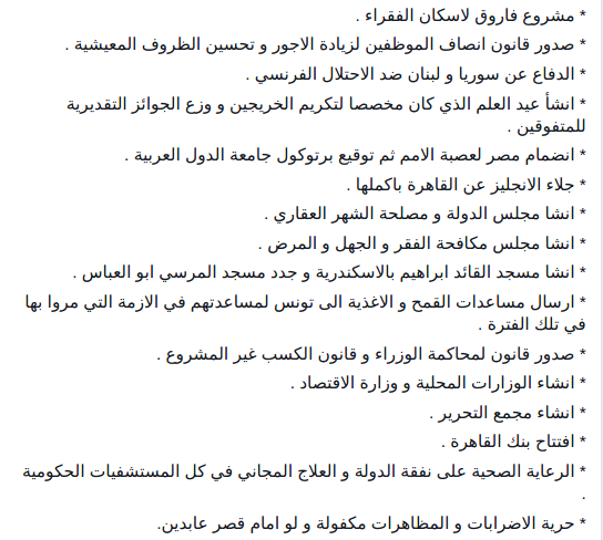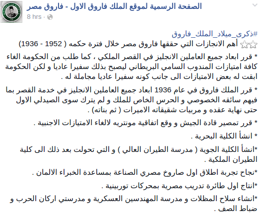 وسردت الصفحة في تدوينة لها على موقع التواصل الاجتماعي "فيس بوك" امتيارزات فاروق والتى كان أهمها " إبعاد جميع العاملين الانجليز في القصر الملكي، وإلغاء كافة امتيازات المندوب السامي البريطاني ليصبح بذلك سفيرا عاديا، إضافة إلى قرر تمصير قادة الجيش، واقرار مجانية التعليم".
